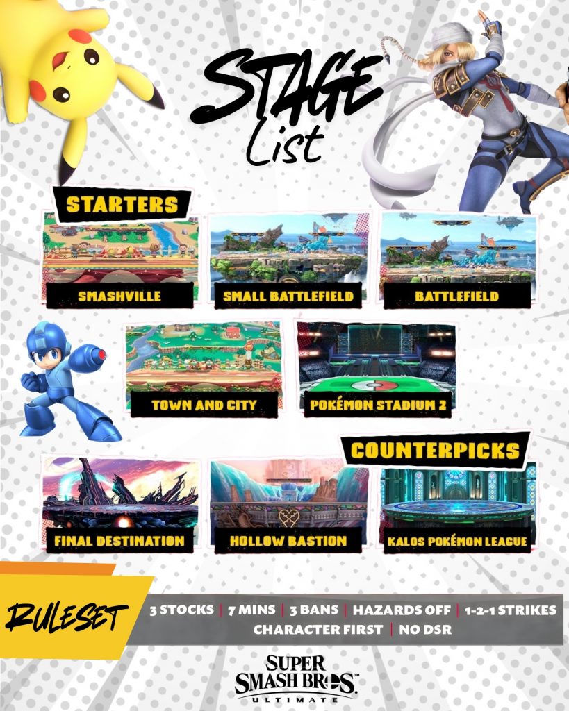 Game 1: Se realiza el «starter stage strike» para determinar el escenario inicial mediante piedra, papel o tijeras. El ganador inicia con el primer ban, el oponente realiza el ban de dos escenarios y, finalmente, el ganador elige entre los dos escenarios restantes dónde se jugará la primera partida.